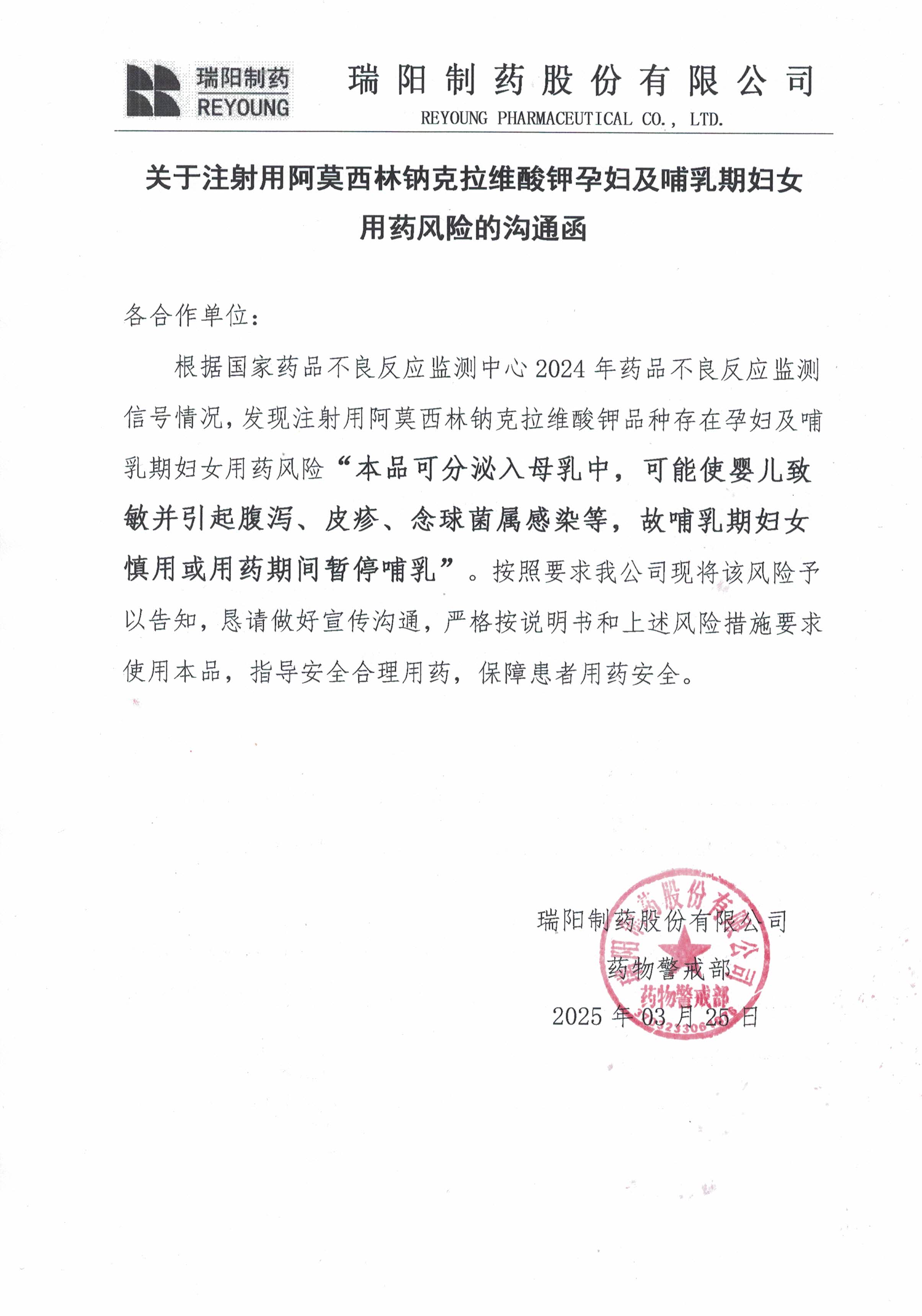 關(guān)于注射用阿莫西林鈉克拉維酸鉀孕婦及哺乳期用藥風(fēng)險(xiǎn)的溝通函